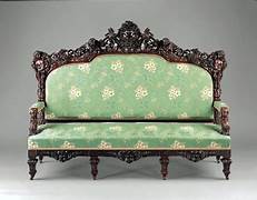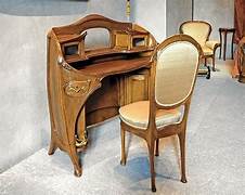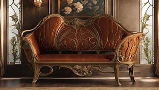 The Art Nouveau period borrowed from a number of previous periods, with elaborate ornamental carvings and veneer inlays offset by brass and chrome hardware. Upholstery in this period was from a variety of opulent fabrics, including velvet, tapestries, leather, and linen.